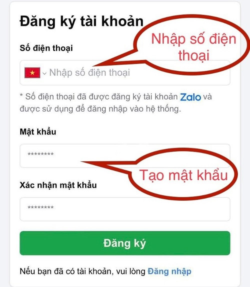 Bước 1: Nhấn đăng ký, bạn nhập số điện thoại và tạo mật khẩu, xác nhận mật khẩu. Sau đó nhấn đăng ký.