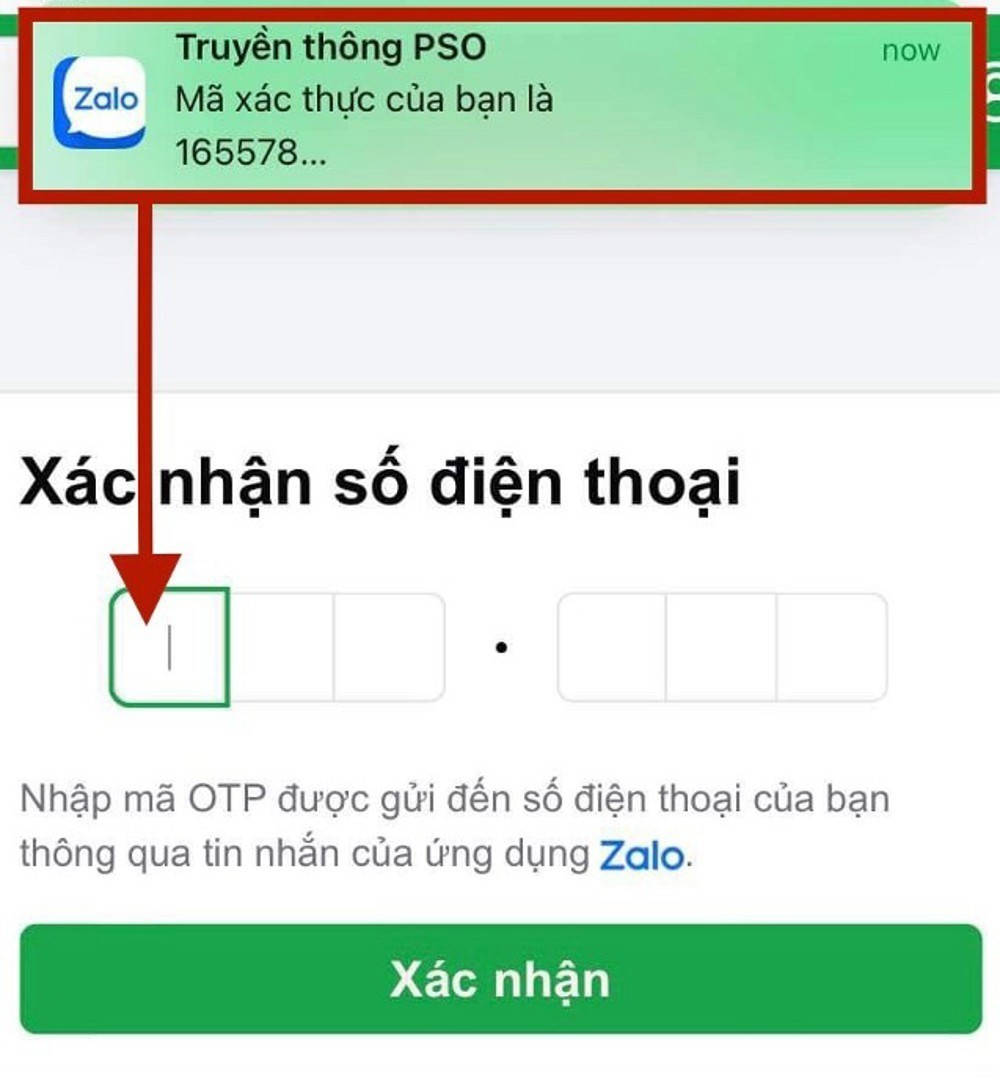 Bước 2: Zalo sẽ gửi mã xác nhận 6 số, bạn nhập vào các ô. Sau đó nhấn xác nhận.
